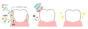 歯科医院で行う**スケーリング(歯石除去)やPMTC(プロによる機械的清掃)**は、バイオフィルムを根本から除去するための唯一の手段です。